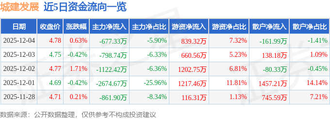 证券之星消息,截至2025年12月4日收盘,城建发展(600266)报收于4.78元,上涨0.63%,换手率1.16%,成交量24.07万手,成交额1.15亿元。