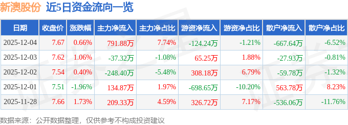 证券之星消息,截至2025年12月4日收盘,新澳股份(603889)报收于7.67元,上涨0.66%,换手率1.83%,成交量13.21万手,成交额1.02亿元。