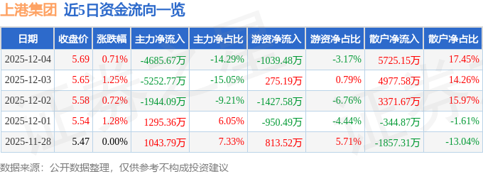 证券之星消息,截至2025年12月4日收盘,上港集团(600018)报收于5.69元,上涨0.71%,换手率0.25%,成交量57.66万手,成交额3.28亿元。