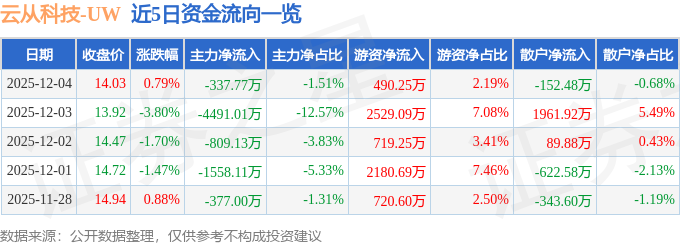 证券之星消息,截至2025年12月4日收盘,云从科技(688327)报收于14.03元,上涨0.79%,换手率1.94%,成交量16.17万手,成交额2.24亿元。