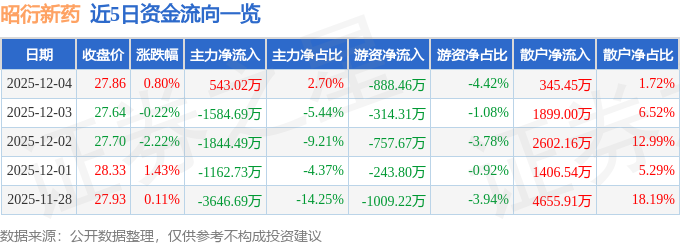 证券之星消息,截至2025年12月4日收盘,昭衍新药(603127)报收于27.86元,上涨0.8%,换手率1.15%,成交量7.23万手,成交额2.01亿元。