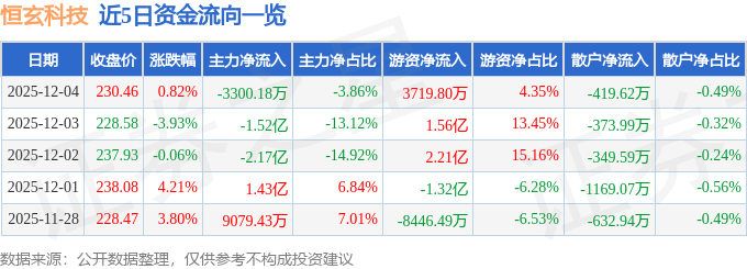 证券之星消息,截至2025年12月4日收盘,恒玄科技(688608)报收于230.46元,上涨0.82%,换手率2.21%,成交量3.74万手,成交额8.54亿元。