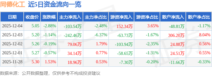 证券之星消息,截至2025年12月4日收盘,同德化工(002360)报收于5.05元,下跌2.88%,换手率2.5%,成交量8.19万手,成交额4171.41万元。
