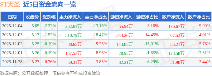 证券之星消息,截至2025年12月4日收盘,ST天圣(002872)报收于5.05元,下跌2.32%,换手率1.62%,成交量3.47万手,成交额1768.06万元。