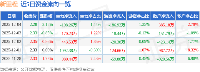 证券之星消息,截至2025年12月4日收盘,新里程(002219)报收于2.28元,下跌2.15%,换手率1.84%,成交量60.22万手,成交额1.38亿元。