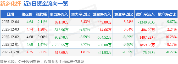 证券之星消息,截至2025年12月4日收盘,新乡化纤(000949)报收于4.64元,下跌2.11%,换手率1.75%,成交量29.82万手,成交额1.39亿元。
