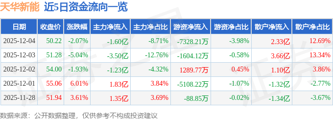 证券之星消息,截至2025年12月4日收盘,天华新能(300390)报收于50.22元,下跌2.07%,换手率5.43%,成交量36.51万手,成交额18.39亿元。
