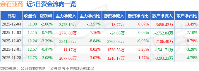 证券之星消息,截至2025年12月4日收盘,金石亚药(300434)报收于11.9元,下跌2.06%,换手率6.29%,成交量21.52万手,成交额2.56亿元。