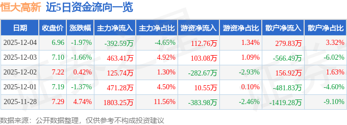 证券之星消息,截至2025年12月4日收盘,恒大高新(002591)报收于6.96元,下跌1.97%,换手率5.35%,成交量11.95万手,成交额8437.96万元。