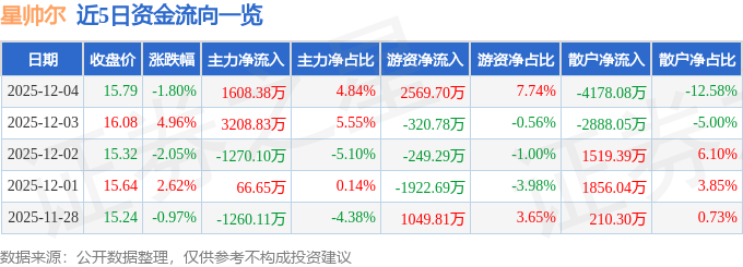 证券之星消息,截至2025年12月4日收盘,星帅尔(002860)报收于15.79元,下跌1.8%,换手率6.02%,成交量21.06万手,成交额3.32亿元。