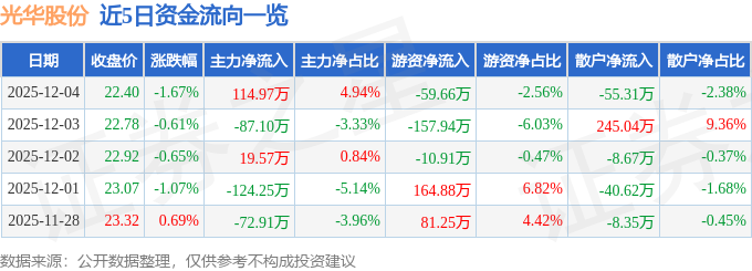 证券之星消息,截至2025年12月4日收盘,光华股份(001333)报收于22.4元,下跌1.67%,换手率2.34%,成交量1.03万手,成交额2328.42万元。