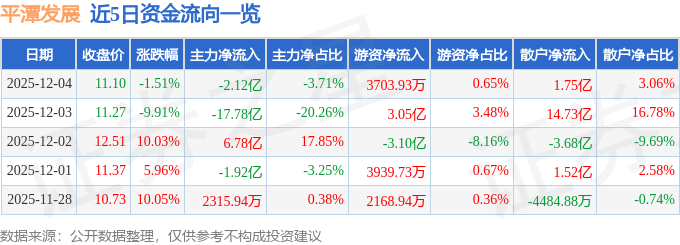 证券之星消息,截至2025年12月4日收盘,平潭发展(000592)报收于11.1元,下跌1.51%,换手率26.73%,成交量511.9万手,成交额57.1亿元。