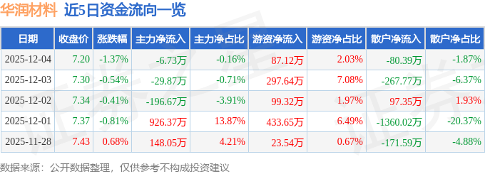 证券之星消息,截至2025年12月4日收盘,华润材料(301090)报收于7.2元,下跌1.37%,换手率0.4%,成交量5.94万手,成交额4298.66万元。