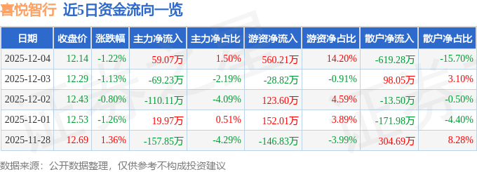 证券之星消息,截至2025年12月4日收盘,喜悦智行(301198)报收于12.14元,下跌1.22%,换手率2.09%,成交量3.25万手,成交额3943.88万元。