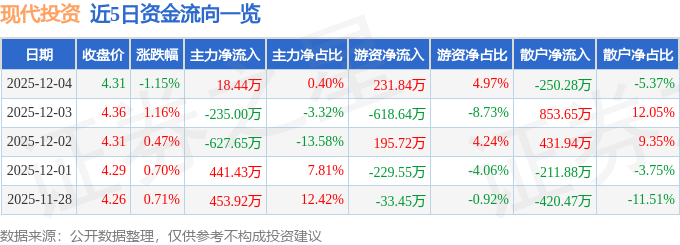 证券之星消息,截至2025年12月4日收盘,现代投资(000900)报收于4.31元,下跌1.15%,换手率0.71%,成交量10.79万手,成交额4662.01万元。