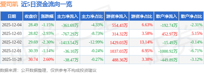 证券之星消息,截至2025年12月4日收盘,爱司凯(300521)报收于28.49元,下跌1.15%,换手率1.94%,成交量2.91万手,成交额8357.37万元。