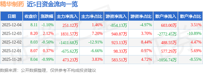 证券之星消息,截至2025年12月4日收盘,精华制药(002349)报收于8.11元,下跌1.1%,换手率2.6%,成交量21.17万手,成交额1.72亿元。