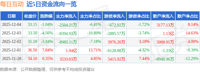 证券之星消息,截至2025年12月4日收盘,每日互动(300766)报收于33.15元,下跌1.04%,换手率3.28%,成交量11.76万手,成交额3.9亿元。