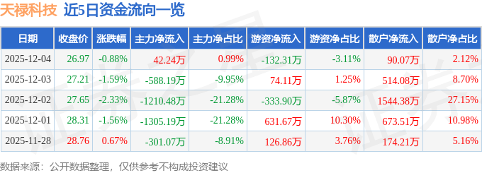 证券之星消息,截至2025年12月4日收盘,天禄科技(301045)报收于26.97元,下跌0.88%,换手率2.46%,成交量1.58万手,成交额4249.96万元。