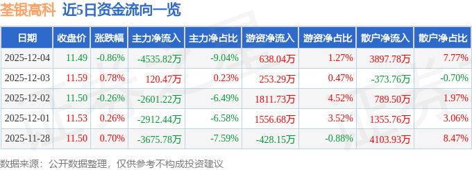 证券之星消息,截至2025年12月4日收盘,荃银高科(300087)报收于11.49元,下跌0.86%,换手率4.86%,成交量43.51万手,成交额5.02亿元。
