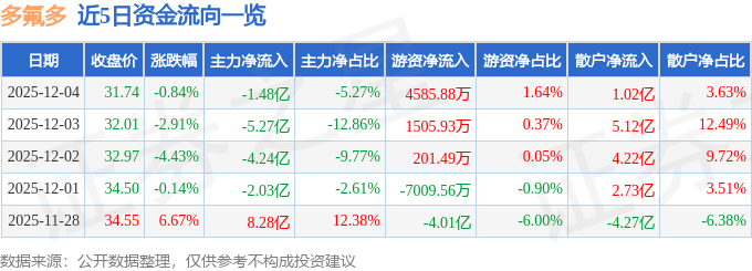 证券之星消息,截至2025年12月4日收盘,多氟多(002407)报收于31.74元,下跌0.84%,换手率8.09%,成交量87.44万手,成交额28.0亿元。