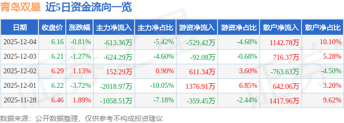 证券之星消息,截至2025年12月4日收盘,青岛双星(000599)报收于6.16元,下跌0.81%,换手率2.26%,成交量18.42万手,成交额1.13亿元。