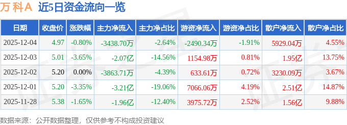 证券之星消息,截至2025年12月4日收盘,万 科A(000002)报收于4.97元,下跌0.8%,换手率2.7%,成交量262.0万手,成交额13.03亿元。