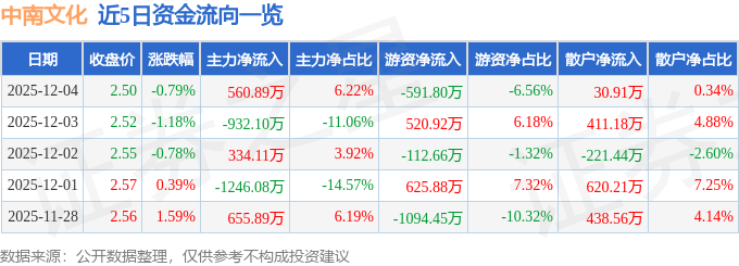 证券之星消息,截至2025年12月4日收盘,中南文化(002445)报收于2.5元,下跌0.79%,换手率1.52%,成交量36.06万手,成交额9017.1万元。