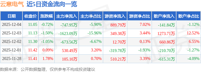 证券之星消息,截至2025年12月4日收盘,云意电气(300304)报收于11.05元,下跌0.72%,换手率1.33%,成交量11.37万手,成交额1.27亿元。