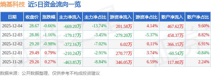 证券之星消息,截至2025年12月4日收盘,熵基科技(301330)报收于28.67元,下跌0.66%,换手率1.49%,成交量1.7万手,成交额4872.04万元。