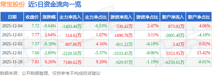 证券之星消息,截至2025年12月4日收盘,常宝股份(002478)报收于7.72元,下跌0.64%,换手率3.85%,成交量27.84万手,成交额2.15亿元。