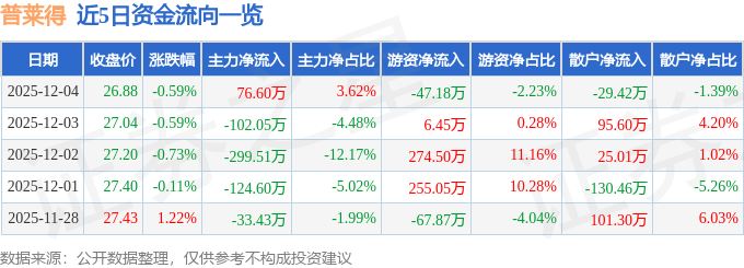 证券之星消息,截至2025年12月4日收盘,普莱得(301353)报收于26.88元,下跌0.59%,换手率2.47%,成交量7880.0手,成交额2115.58万元。