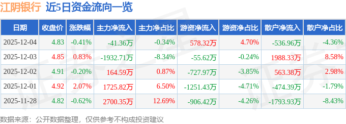 证券之星消息,截至2025年12月4日收盘,江阴银行(002807)报收于4.83元,下跌0.41%,换手率1.04%,成交量25.45万手,成交额1.23亿元。