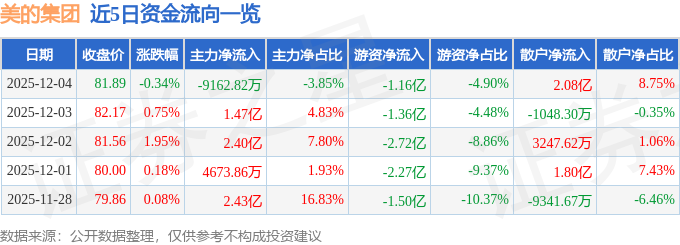 证券之星消息,截至2025年12月4日收盘,美的集团(000333)报收于81.89元,下跌0.34%,换手率0.42%,成交量28.92万手,成交额23.78亿元。