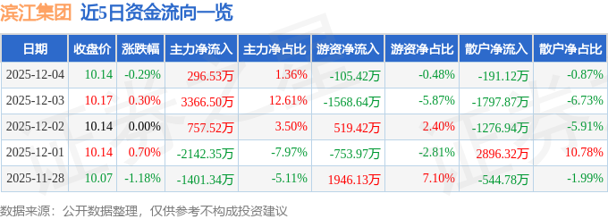 证券之星消息,截至2025年12月4日收盘,滨江集团(002244)报收于10.14元,下跌0.29%,换手率0.8%,成交量21.4万手,成交额2.19亿元。