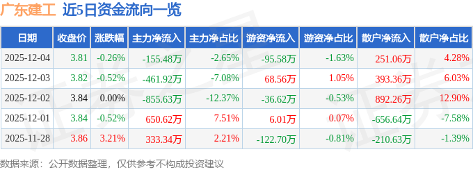 证券之星消息,截至2025年12月4日收盘,广东建工(002060)报收于3.81元,下跌0.26%,换手率0.98%,成交量15.37万手,成交额5866.65万元。