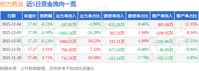 证券之星消息,截至2025年12月4日收盘,佐力药业(300181)报收于17.02元,下跌0.23%,换手率0.63%,成交量3.81万手,成交额6485.22万元。