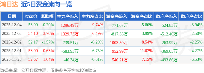证券之星消息,截至2025年12月4日收盘,鸿日达(301285)报收于53.99元,下跌0.2%,换手率3.14%,成交量2.46万手,成交额1.33亿元。