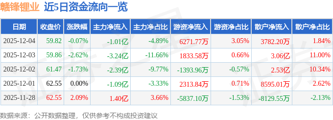 证券之星消息,截至2025年12月4日收盘,赣锋锂业(002460)报收于59.82元,下跌0.07%,换手率2.84%,成交量34.39万手,成交额20.56亿元。