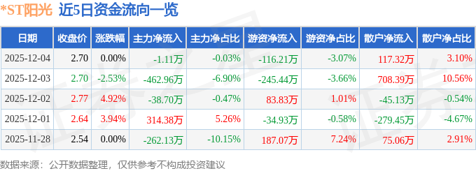 证券之星消息,截至2025年12月4日收盘,*ST阳光(000608)报收于2.7元,上涨0.0%,换手率1.88%,成交量14.0万手,成交额3788.36万元。
