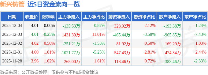 证券之星消息,截至2025年12月4日收盘,新兴铸管(000778)报收于4.01元,上涨0.0%,换手率0.99%,成交量38.68万手,成交额1.55亿元。
