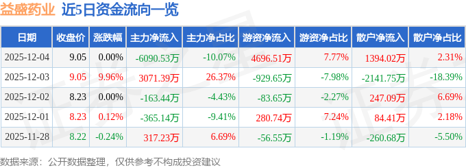 证券之星消息,截至2025年12月4日收盘,益盛药业(002566)报收于9.05元,上涨0.0%,换手率27.98%,成交量64.85万手,成交额6.05亿元。