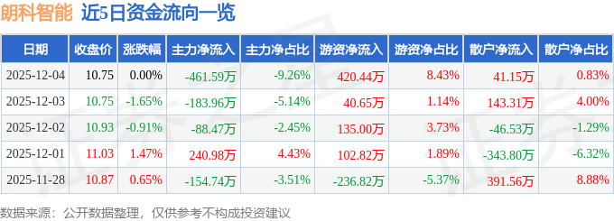 证券之星消息,截至2025年12月4日收盘,朗科智能(300543)报收于10.75元,上涨0.0%,换手率1.86%,成交量4.65万手,成交额4984.76万元。