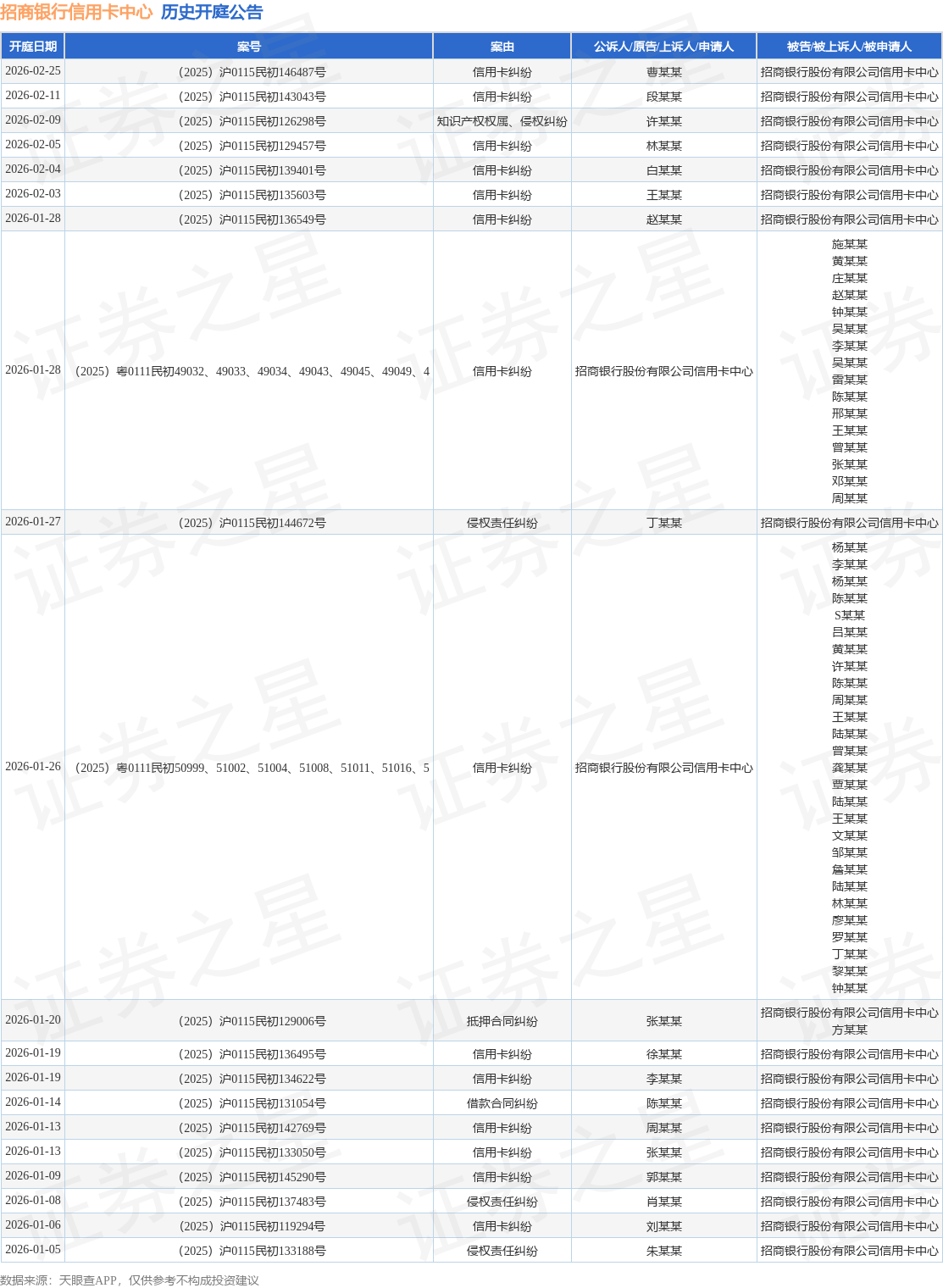 案号:(2025)沪民申4751号根据统计,近一年内以招商银行股份有限公司信用卡中心为当事人的历史开庭公告有12730则,其中案由为“信用卡纠纷”的公告以10019则居首,其次为“金融借款合同纠纷”有2595则,“小额借款合同纠纷”有30则。历史开庭公告(前20条)如下: