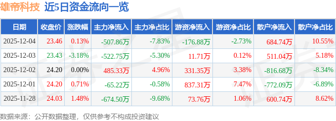证券之星消息,截至2025年12月4日收盘,雄帝科技(300546)报收于23.46元,上涨0.13%,换手率2.06%,成交量2.76万手,成交额6488.94万元。