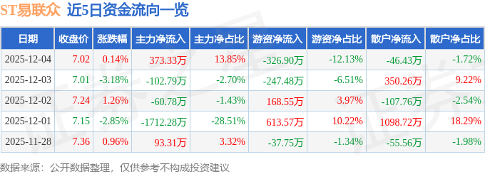 证券之星消息,截至2025年12月4日收盘,ST易联众(300096)报收于7.02元,上涨0.14%,换手率0.89%,成交量3.83万手,成交额2695.96万元。
