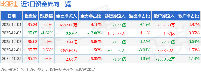 证券之星消息,截至2025年12月4日收盘,比亚迪(002594)报收于95.24元,上涨0.2%,换手率0.48%,成交量16.61万手,成交额15.77亿元。