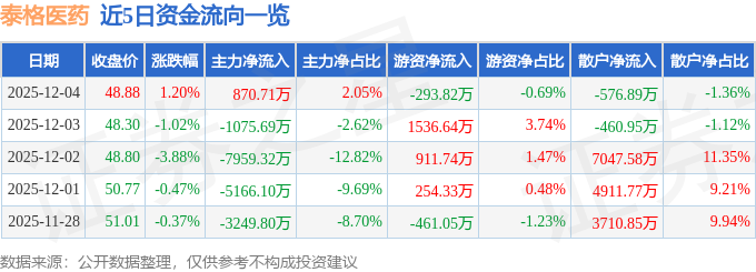 证券之星消息,截至2025年12月4日收盘,泰格医药(300347)报收于48.88元,上涨1.2%,换手率1.55%,成交量8.76万手,成交额4.25亿元。