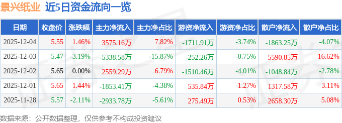 证券之星消息,截至2025年12月4日收盘,景兴纸业(002067)报收于5.55元,上涨1.46%,换手率6.17%,成交量82.51万手,成交额4.57亿元。