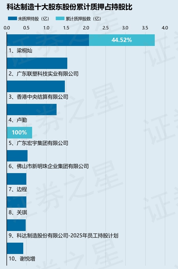 截止本公告日,股东梁桐灿已累计质押股份1.67亿股,占其持股总数的44.52%,股东广东宏宇集团有限公司已累计质押股份6434.12万股,占其持股总数的100.0%。本次质押后科达制造十大股东的累计质押股份占持股比例(占持股比例的计算以公司最新一期财务报表公布的十大股东的持股总数为基准)见下图: